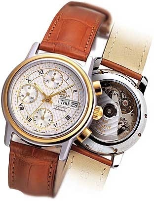 В пределах своей категории - золотых часов это, не больше - не меньше мировой рекорд: самые тонкие часы в мире в золотом корпусе, их толщина чуть менее 3,5 миллиметров. Флагман новой коллекции INFINITUS снабжен кварцевым механизмом ETA толщиной 0.98 мм. Стекло сапфировое.
